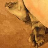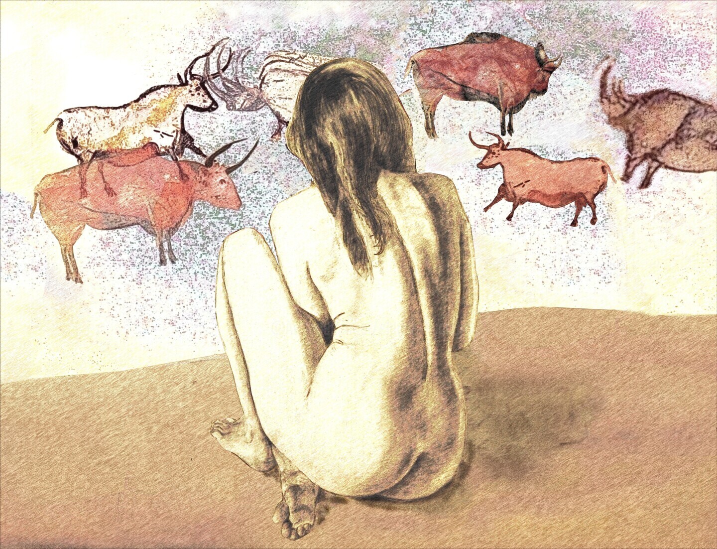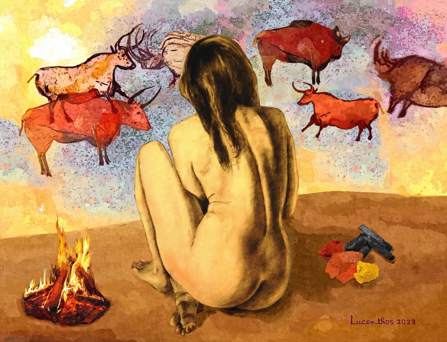 Cette œuvre fait pendant à celle intitulée « contemplation rupestre ». Y a-t-il une différence entre contemplation et fascination ? Ce n’est pas le problème, l’intention est de figurer ici dans un imaginaire préhistorique modernisé, l’attitude d’une femme qui, cette fois-ci, ne se contente pas seulement d’admirer les peintures d’animaux sur les parois de son habitat mais, comme veut en témoigner la présence du feu, des morceaux de charbon et d’ocre qui sont près d’elle, qui est elle-même l’artiste en train de réaliser cette œuvre. En effet il n’est pas certain que seuls les hommes de ces époques lointaines aient exécuté ces peintures car on sait maintenant que les femmes participaient à toutes sortes de travaux et n’étaient pas nécessairement confinées à la garde du foyer dans les grottes habitées. Ce travail est constitué d’abord d’un collage d’un de mes dessins de nu réalisé en atelier, d’animaux et d’images d’objets retravaillées, le tout retraité au moyen de différents outils numériques.