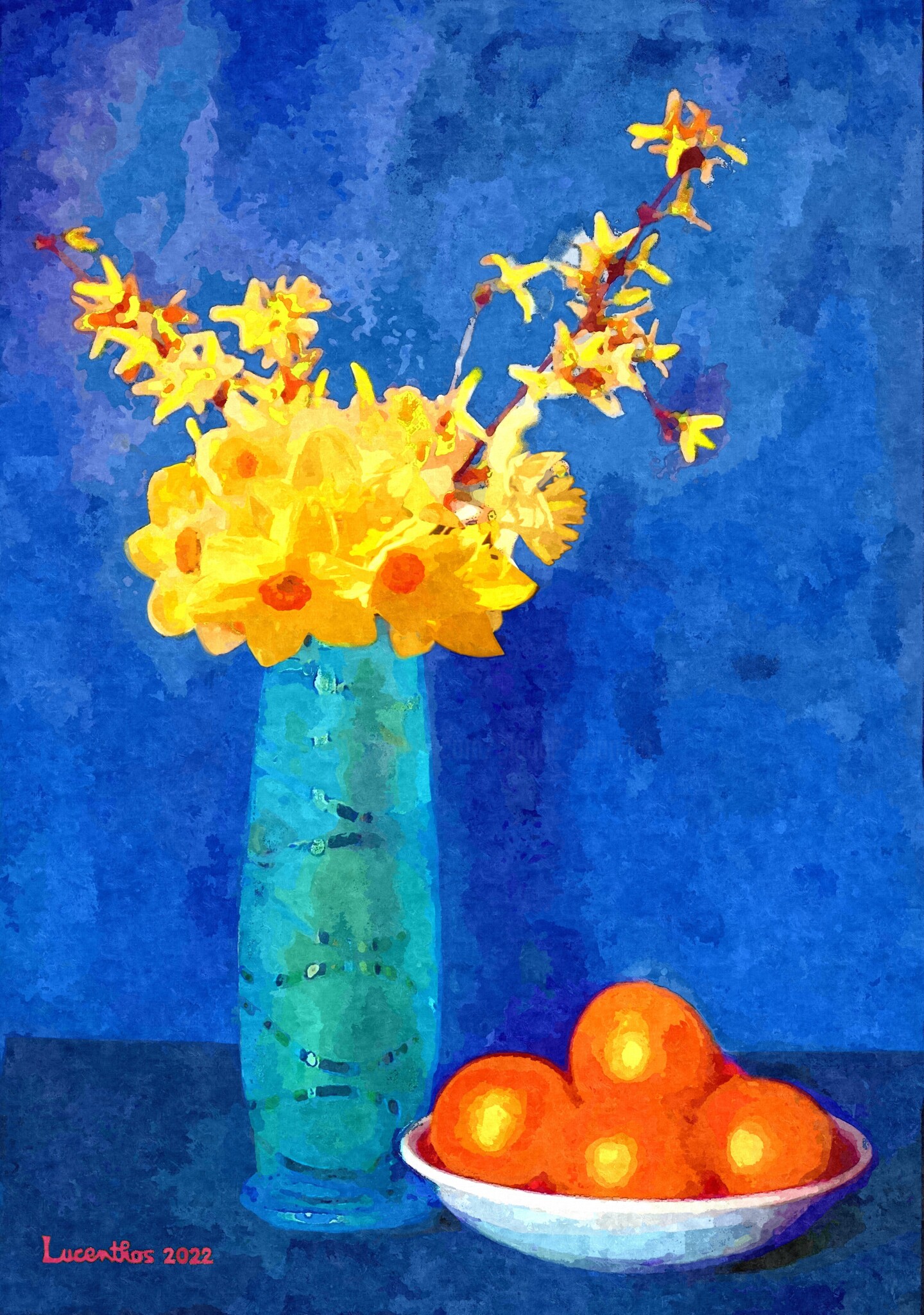 Ce tableau associe jonquilles, forsythias et oranges. Le vase aux entrelacs m’a beaucoup servi pour mes peintures de bouquets. L’orangé, le jaune et le bleu font une harmonie à laquelle s’ajoute la teinte verte du vase. Le forsythia que j’ai souvent repris sur le thème des fleurs est comme un autre mimosa dans les régions qui ne bénéficient pas du climat méditerranéen.