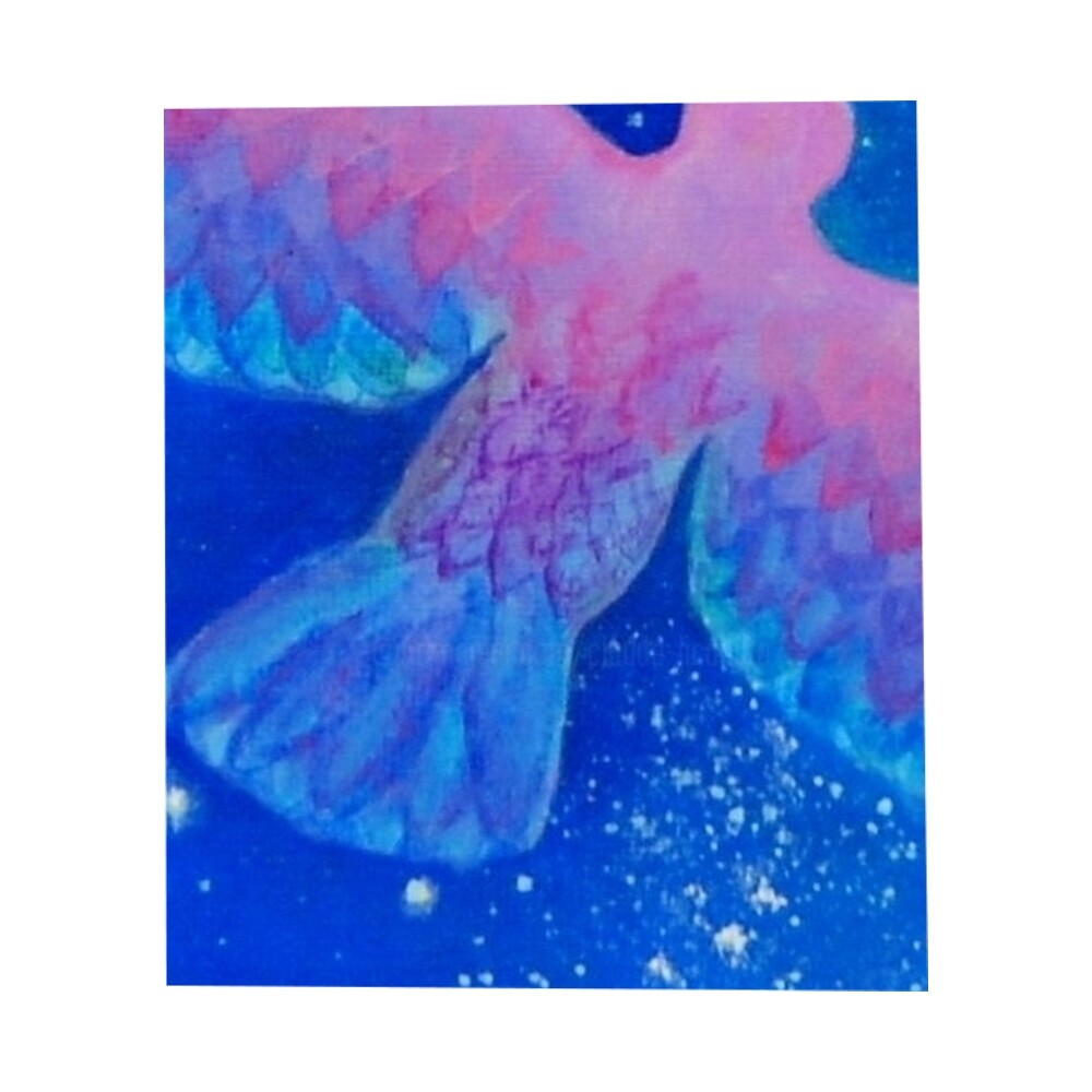 Ce tableau digital a commencé par un découpage de formes dans du papier crépon pour finir, étape par étape, ajout ou soustraction de couleur, en cette envolée nocturne. Les oiseaux voyagent aussi de nuit dans un ciel onirique où l’imagination suit son cours sous les constellations…Les enfants à qui j'ai montré cette peinture l'aiment beaucoup et certains en ont une reproduction dans leur chambre. Le sujet est apaisant et le vol est libérateur.